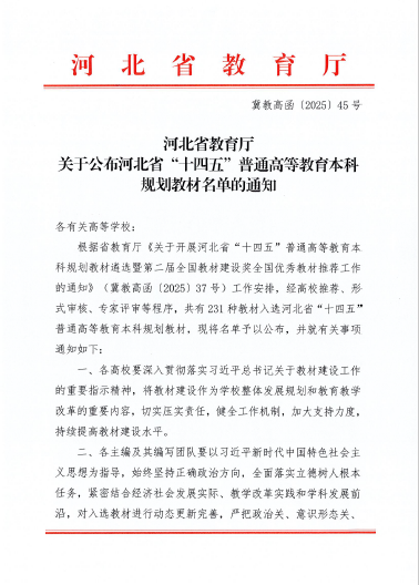 近日,河北省教育厅公布了《关于公布河北省“十四五”普通高等教育本科规划教材名单的通知》(冀教高函〔2025〕45号)。我院推荐的《中国税制》(第2版)教材入选河北省“十四五”普通高等教育本科规划教材,是《中国税制》教学团队继获评省级优秀教学团队后,斩获的又一省级教学成果。