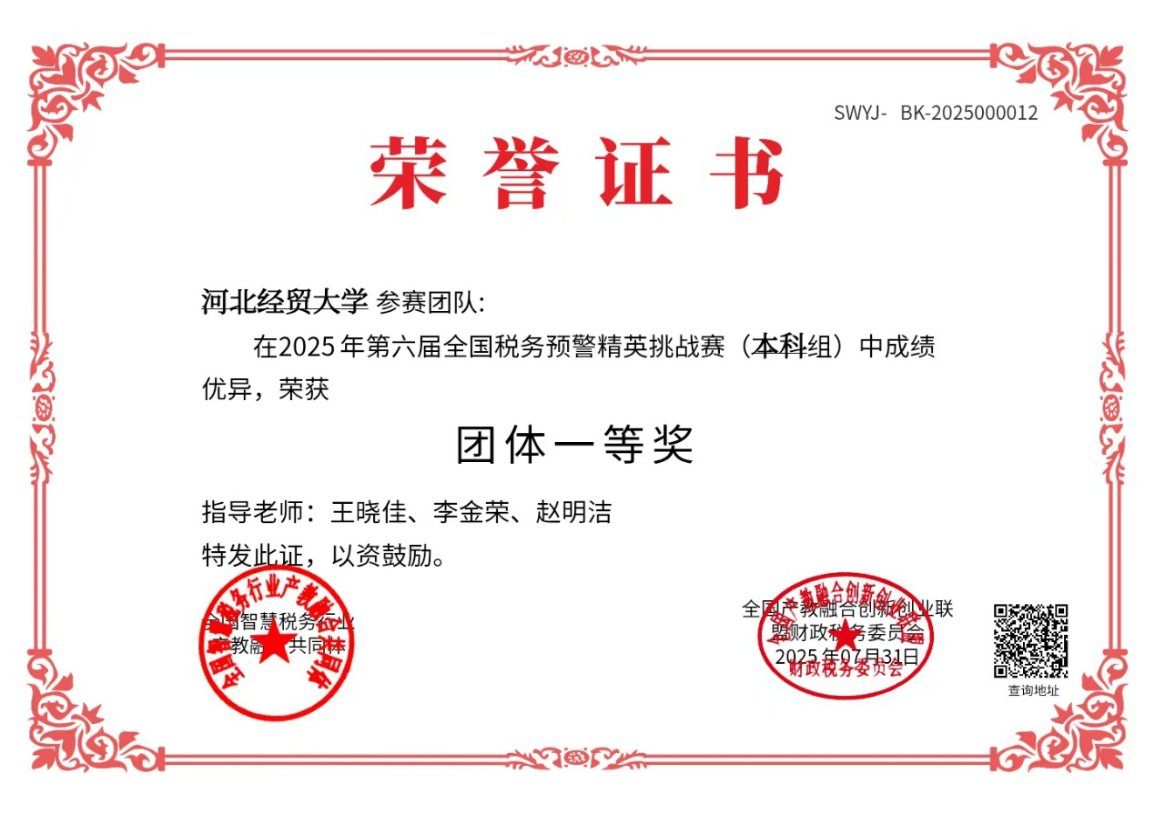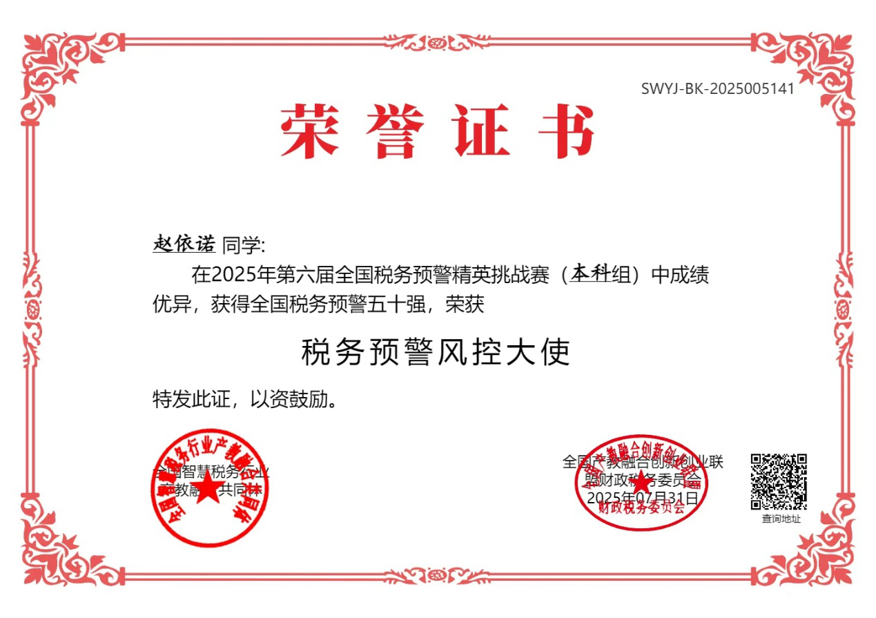 2025年7月,全国智慧税务行业产教融合共同体主办了第六届“衡信杯”全国税务预警精英挑战赛(本科院校赛道),共有来自全国124所本科院校的近5800名选手同场竞技,共同展现财税专业领域的知识储备与实践能力。通过系统培训、模拟演练等方式提升学生的专业素养。2025年7月7日至7月27日,通过连续21天的线上比赛,学院257名同学持之以恒地凭借扎实的专业功底和出色的临场发挥,最终脱颖而出,再次荣获团体赛一等奖,其中,2024级研究生赵依诺同学更是以优异的成绩跻身全国前50强并荣获税务预警风控大使,实现学院零的突破,充分展现了我院学子的卓越风采和专业水平!