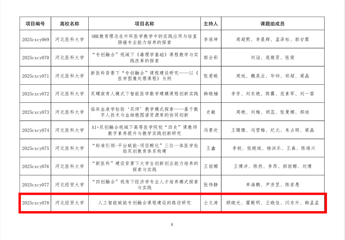 近日,河北省教育厅公布了2025年省级创新创业课程、教改项目立项建设名单,太阳集团网tyc9728收获颇丰!白云老师负责的课程成功入选省级创新创业课程,仝文涛老师牵头的项目获批省级教育教学改革研究与实践项目,彰显了学院在创新创业教育与教学改革领域的扎实功底与创新突破。