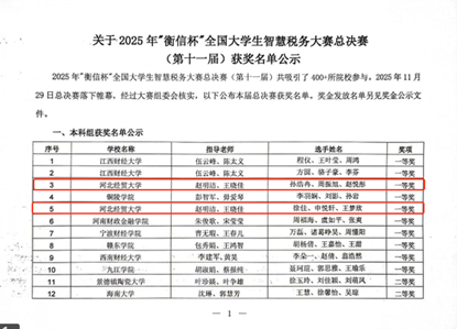 大赛历经校赛、省赛、国赛,高度仿真涉税工作环境,总决赛设置了风险管理、税务风控及税务合规三个关键岗位,全面考查参赛选手在纳税评估、财税大数据风控、税务合规等方面的理论素养与实务操作综合能力。由我院赵明洁、王晓佳老师指导的两支代表队凭借扎实的专业功底、默契的团队协作与出色的综合素养,在全国本科高校58组队伍中一举斩获全国第三名、第五名的优异成绩,双双荣膺大赛一等奖,并分别获得大赛奖金2000元和1000元。我院因在赛事组织、人才培养成果等方面的突出表现,被授予 “赛事星推官” 荣誉称号,实现学子竞技与学院品牌的双重突破。
