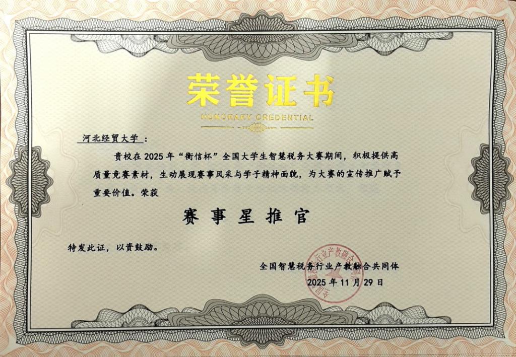 此次佳绩的取得,是我院坚持 “以赛促教、以赛促学、产教融合” 育人理念的生动实践,更是推进产教协同育人的丰硕成果。“赛事星推官” 荣誉的获得,不仅是对我院人才培养质量的高度肯定,更是对学院在智慧税务教育领域行业影响力的充分认可。未来,我院将继续以各类高水平专业赛事为抓手,持续深化教学改革,优化实践育人模式,推动专业教学与行业需求、国家战略紧密对接,培养更多 “专业过硬、情怀深厚” 的高素质复合型人才,在人才培养与学科建设的道路上再创辉煌!
