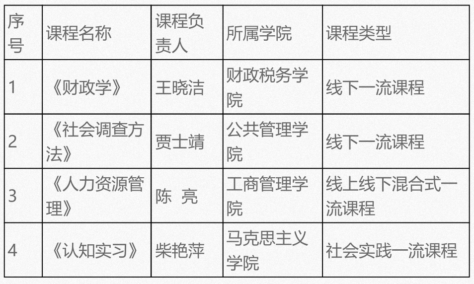 2020年10月30日,教育部发布了《关于首批国家级一流本科课程认定结果的公示》。据统计,我校共有4门课程入选首批国家级一流本科课程,其中线下一流课程2门、线上线下混合式一流课程1门、社会实践一流课程1门。其中,我院《财政学》课程成功入选。