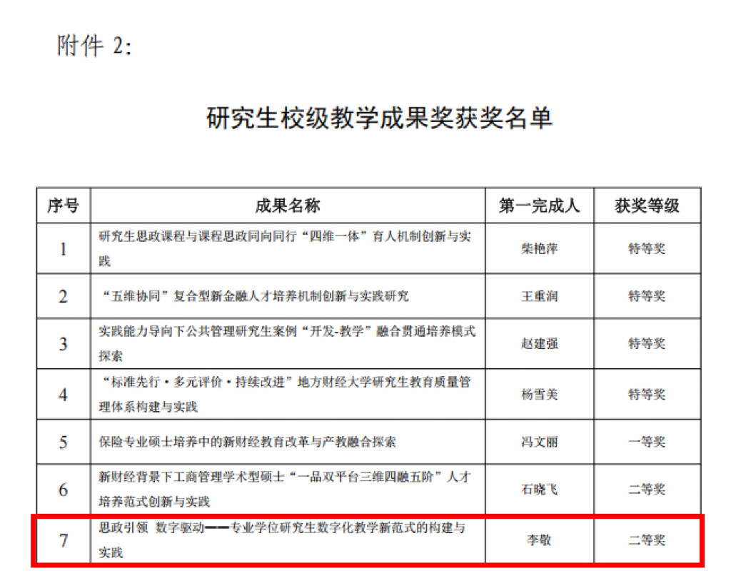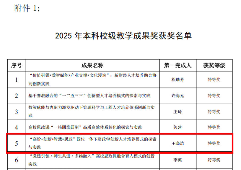 近日,学校正式公布了《关于公布2025年校级教学成果奖获奖名单的通知》,财税学院在教学改革与创新中锐意进取,捷报频传,在本科教育与研究生教育领域双双斩获佳绩,共荣获两项重磅大奖:我院王晓洁院长主持完成的教学成果《“高阶+创新+智慧+思政”四位一体下财政学创新人才培养模式的探索与实践》,荣获本科校级教学成果特等奖;李敬教授主持完成的《思政引领 数字驱动——专业学位研究生数字化教学新范式的构建与实践》荣获研究生校级教学成果二等奖。