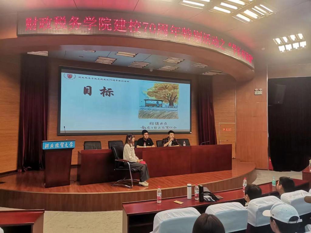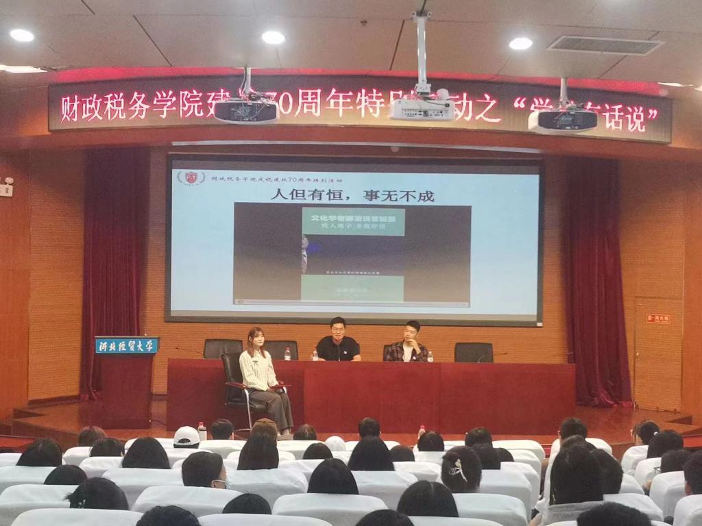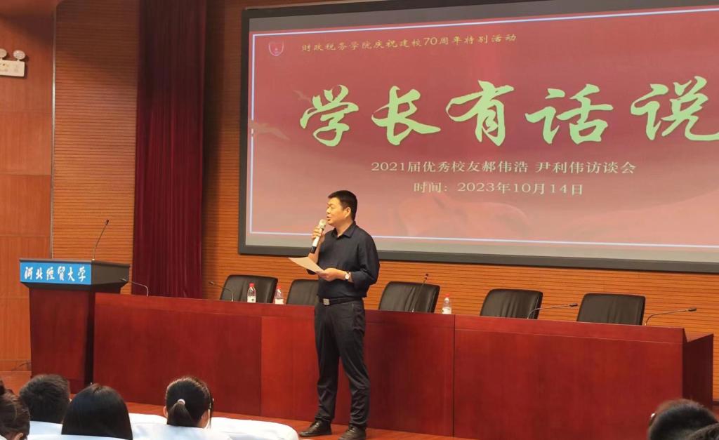 10月14日上午,太阳集团网tyc9728在国际学术报告厅举办庆祝建校70周年特别活动之“学长有话说”访谈会。本次访谈会特邀我院优秀校友、中国电子(CEC)旗下中国电子系统工程第四建设有限公司郝伟浩,我院优秀校友、国家税务总局天津市南开区税务局尹利伟莅临现场,以访谈方式为学生答疑解惑,院党委书记郝江华、退休教师刘连环、资产评估教工党支部书记张志超、专职组织员黄培和200余名学生参加。