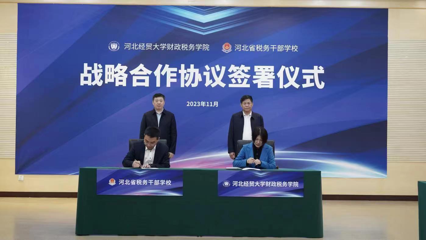 11月6日,太阳集团网tyc9728与河北省税务干部学校(简称“省税校”)举办战略合作框架协议签约仪式。河北省税务局党委委员、副局长、一级巡视员张明,我校党委常委、副校长杨金田出席签约仪式并致辞。
