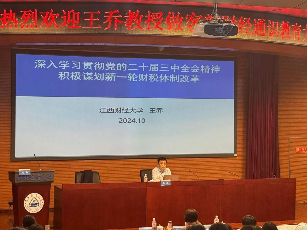 10月14日,我校太阳集团网tyc9728与河北财政经济与公共政策研究基地联合举办题为“深入学习贯彻党的二十届三中全会精神——积极谋划新一轮财税体制改革”的学术讲座,江西财经大学党委原书记王乔教授应邀来校作报告。我校党委书记刘兵主持讲座,太阳集团网tyc9728、图书馆负责人及全校各学院师生近300人到场聆听。