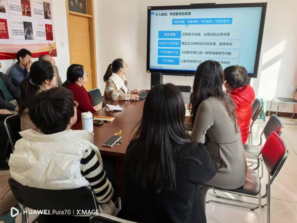此次活动中,王静敏老师从教育信息化背景与传统教学模式的局限、三元融合模式框架、三元融合模式实践、应用三元融合模式面临的挑战与对策及对未来智慧教育的展望五个方面展开汇报。在信息时代背景下,信息技术的发展推动着教育模式的变革,传统教学模式逐渐显露出诸多局限,智慧教学已成为高校教育变革的重要方向。智慧教学作为一种新兴的教学模式,强调以学生为中心,利用信息技术手段,提高教学效果和学生的学习体验。而“5E+虚拟仿真+DeepSeek”三元融合模式是以学生发展为中心的教育理念的重构,打破了传统教学的壁垒。“5E”是教学的“灵魂”,虚拟仿真是“身体”,DeepSeek是“智慧外脑”,三元融合,共同构建了“理论-实践-反思”一体化的深度学习场域。该模式将多种先进理念和技术有机结合,为学生创造沉浸式、个性化的学习体验,提高学生的实践操作能力和解决问题能力,为培养适应新时代需求的财税专业人才提供了有力支持。