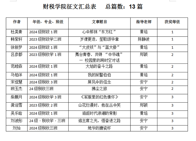 我院在2024年“中华魂”(毛泽东崇高精神风范)主题教育征文比赛中荣获佳绩,共有13份作品脱颖而出,其中校级一等奖3项,二等奖5项,三等奖5项。