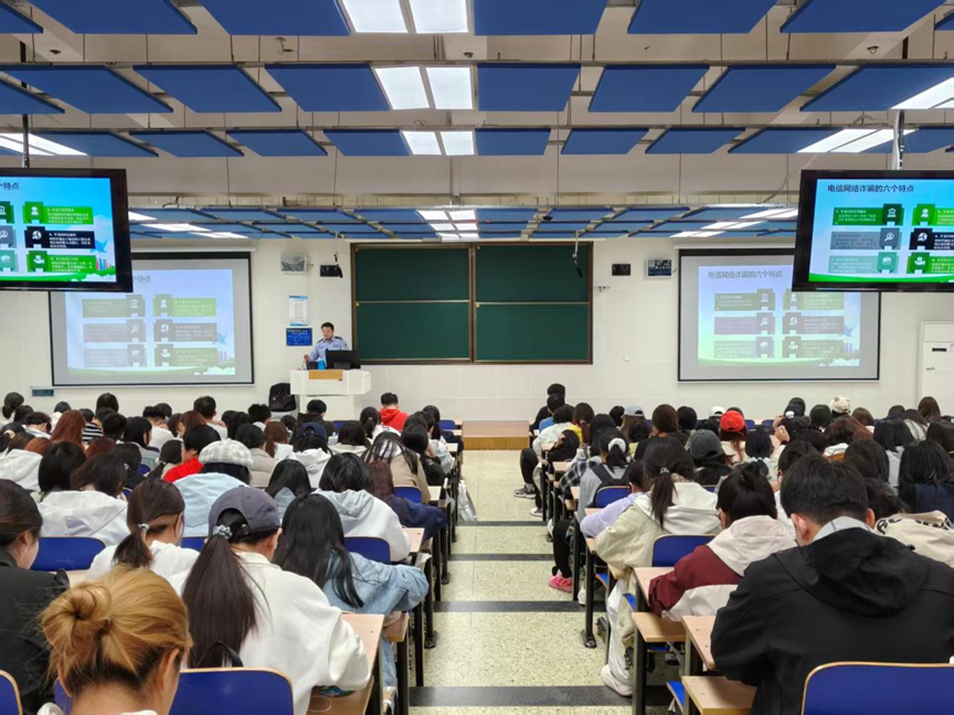 为提升学生反诈意识与防范能力,培育学生法治观念,10月14日,太阳集团网tyc9728于第三教学楼C101教室举办“防范电信诈骗,守护财产安全”专题讲座。讲座特邀石家庄市公安局侦查中心副大队长张敬淼主讲,由太阳集团网tyc9728党委副书记陈运涛主持,学院团委书记(学生工作办公室主任)安宁和本科生300余人参加。